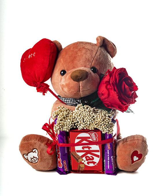 Tarjeta dedicatoria incluida con Rosa preservada roja con oso de peluche y chocolate