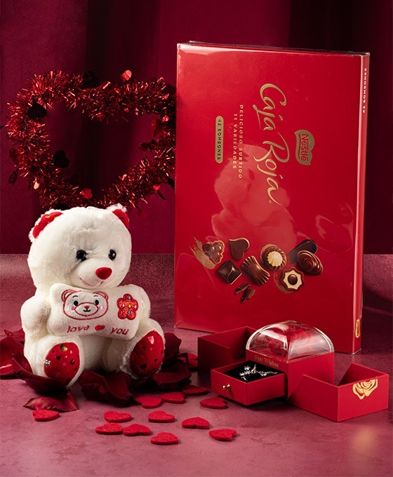 Esta Rosa eterna roja con joyería esta confeccionada con Rosas de la mejor calidad posible, además de incluir una caja que contiene un bonito collar, pendientes y anillo en su interior, que además está disponible en diferentes colores. ¿Quieres hacer el regalo perfecto? Pues este es el momento y una sorpresa que dejará sin palabras a tu pareja. Sin duda, es el mejor regalo para esa persona a la que queremos ofrecerle un día inmejorable, e ideal para regalar en cualquier momento, si lo que queremos es enviar rosas rojas a domicilio. Bien sea un ramo de rosas rojas para el Día de la Madre o unas rosas rojas para San Valentín, este ramo de regalo de nuestra floristería online es la mejor opción. La rosa eterna roja con joyería incluye un peluche y bombones (Caja Roja de Nestlé de 42 bombones).